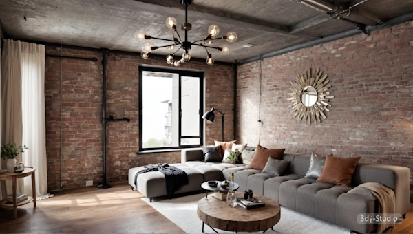 Цветовая палитра - натуральная: серый, терракотовый, чёрный, оттенки дерева и металла. Мебель - микс винтажа и современности, а декор часто выполнен в духе минимализма или содержит индустриальные элементы: трубы, прожекторы, графику.